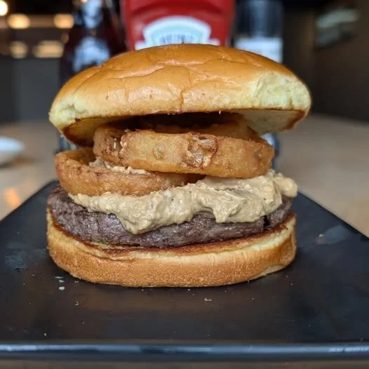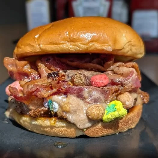 TRUST THE PROCESS 2026: hamburger topped with hot honey, bacon, peanut butter banana sauce, and peanut butter chocolate charmed cereal! ($15 - comes with your choice of side)