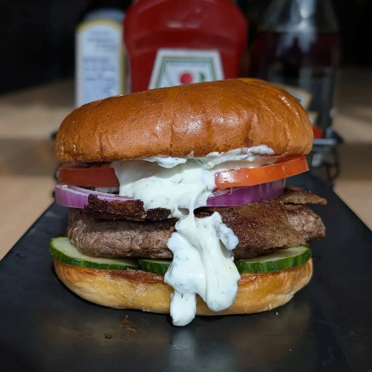 PERCY JACKSON - Burger of the Week with gyro meat, tzatziki, cucumber, tomato, and red onion! ($15 - comes with your choice of side)
