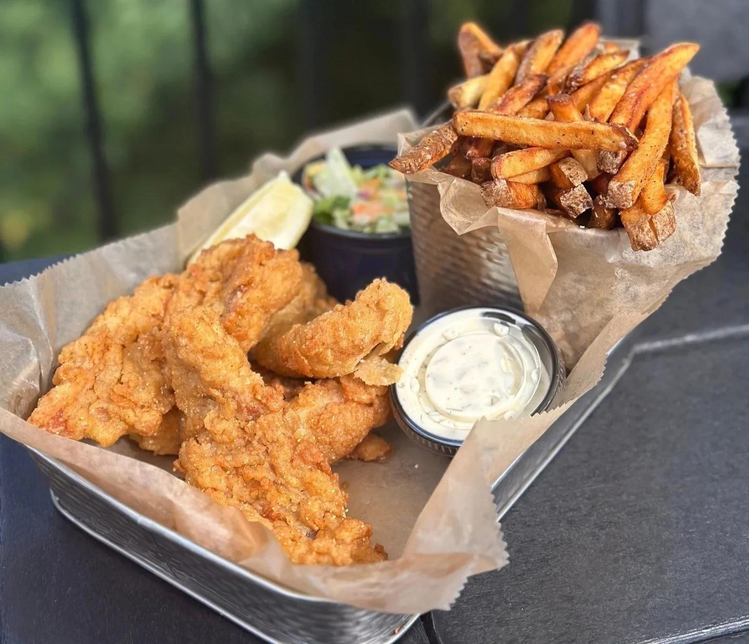 Hot cheese dip with shredded chicken and Buffalo sauce, served with celery, carrots, and fresh fried pita chips ($13)